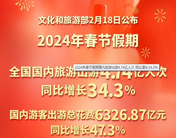 返乡+旅游成为了2024年春节假期文旅市场的一个重要特点,据相关统计,我国2024年春节假期国内旅游出游达4.74亿人次,同比增长34.3%,国内游客出游总消费为6326.87亿元,同比增长了47.3%。纳入国家级夜游消费场景客流量达9851.21万人次,同比增长了58.31%。文旅市场迎来了强劲的复苏。以下是对全国2024年新春假期旅游市场相关数据的汇总报告: