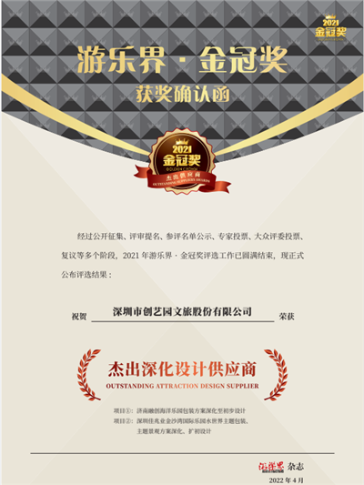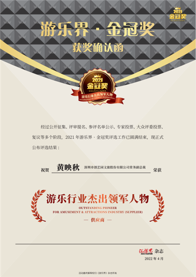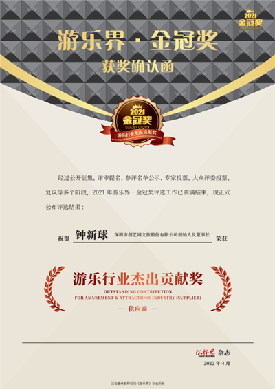 近日,由《游乐界》主办的“2021游乐界·金冠奖评选活动”,经过公开征集、评审提名、参评名单公示、专家投票、大众评委投票、复议等多个严格评选阶段,摩登6文旅凭实力脱颖而出,再度荣膺金冠奖,凭借济南融创海洋乐园、北京金沙湾国际乐园水世界项目斩获了 “杰出深化设计供应商”奖项;集团创始人及董事长钟新球先生荣获“游乐行业杰出贡献”奖项;集团常务副总裁黄映秋女士荣获“游乐行业杰出领军人物”荣誉称号。