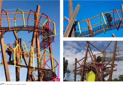 加兰花径的简单性邀请人们来奔跑、攀爬和滑行。由于加兰花径在空中几个点有相当大程度的提升、以及弯曲的岸线,这些对于4~8岁的孩子是个尤其大的挑战。此外,加兰花径的具有非常高的娱乐性:在繁华的日子里,常常有超过100个孩子同时在加兰花径这里玩耍嬉戏。花环是非常高的,在一个忙碌的 日子里,有一百多个孩子。对于不同年龄、拥有不同运动能力的孩子,他们用加兰花径的方式繁多。在陡峭的部分,花径也是一个滑道,而在花径的另-端,它又变成了管状的滑道。在弓形区域的下面,设置了吊床,而在其花径的另一端,又被两个不同的层级所分离。在基地的入口空间,花径向上升起,形成一个拱门,从这个奇妙的视角中,孩子们可以看见公园的内部空间。花径蜿蜒的动势不断地创造着变换的视角,它刺激这上下、内外空间的不停互动。