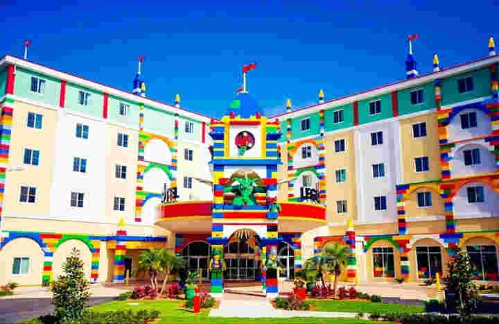 以最强调体验的酒店项目为例,在乐高主题乐园大门外,有乐高主题酒店。酒店设计以乐高积木为元素,在酒店入口、廊柱上使用缤纷小色块构筑鲜艳的建筑立面,模仿积木样式进行搭建。